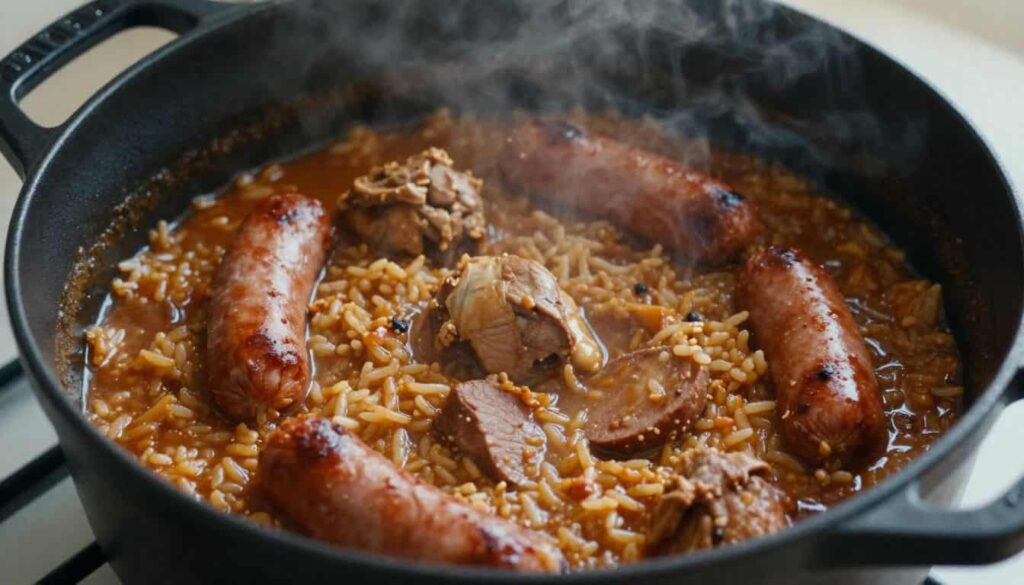 Jambalaya is known for its deep flavor, built slowly through browned meat, aromatic vegetables, and seasoned rice cooked together in broth. Unlike rushed versions, this recipe focuses on proper technique—layering flavors at every stage so the rice absorbs the richness of the chicken and sausage.
